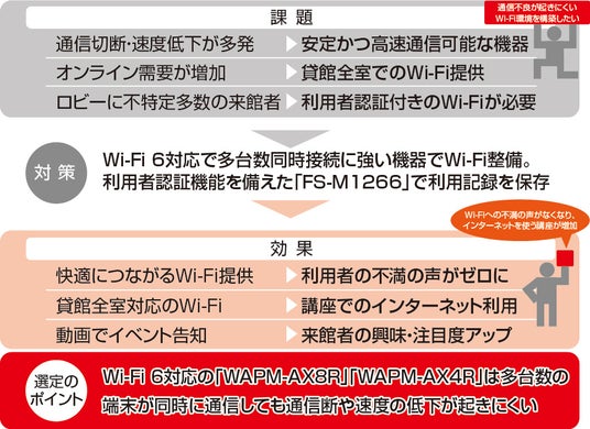 通信切断や速度低下のない環境を整えるためにWi-Fi環境を強化。Wi-Fi 6(11ax)対応機器で貸館利用者と来館者向けの2つのWi-Fiを提供