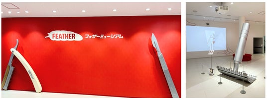 フェザーミュージアムは、2016年に総リニューアルを実施。歴代のフェザー製品の展示や、製品にまつわるヒストリーを体感できる「フェザー・ヒストリー」に加え、2階部分に「切る」をテーマにした、クイズや物を切る仕組みを体感しながら学べるコーナーを新設しました。他にも、巨大カミソリのオブジェやトリックアートなど、フォトスポットも館内各所に点在しています。