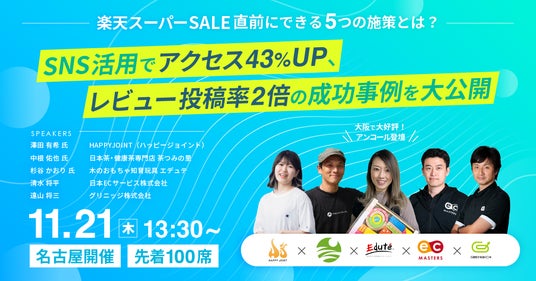 日本全国の楽天ショップ約2,600社が所属する「ECマスターズクラブ」を運営する日本ECサービス株式会社(本社:東京都渋谷区、代表取締役:清水 将平)は、2024年11月21日(木)に名古屋で楽天ショップ事業者対象のセミナーを開催します。「楽天スーパーSALE直前にできる5つの施策とは?SNS活用でアクセス数が43%UP!レビュー投稿率2倍の成功事例を大公開」をテーマに3名の楽天ショップをお招きし、成功事例をお話しいただきます。