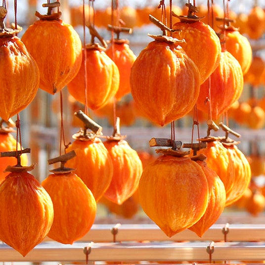歴代将軍にも愛された幻の干し柿「堂上蜂屋柿」は、蜂蜜のように甘い干し柿といわれています。この「堂上蜂屋柿」は、岐阜県美濃加茂市蜂屋の地で受け継がれてきた伝統的な製法でつくられ、一つひとつが手作りのため数が少なく、とても希少で高級な干し柿です。