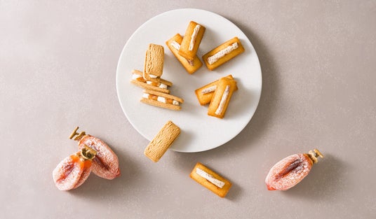 バターの濃厚な風味と香ばしいアーモンドプードルの香りが広がるふぃなんしぇ。生地の食感をより良くするため改良しました。カットした蜂屋柿の果肉をトッピングした、贅沢で特別感のあるお菓子に仕上げました。