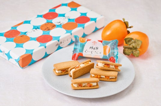 ホワイトチョコと細かく刻んだ干し柿を練り込んだコクのあるバタークリームを、しっとりと焼き上げたクッキーでサンドしました。口当たりの良いクリームに果肉の食感をしっかりと味わえるサイズの蜂屋柿をトッピングしています。