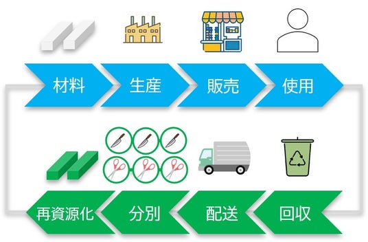 従来のリサイクル方法では、金属だけの刃物はスクラップとして引き取られ再度ステンレスや鉄になりますが、ハンドルが樹脂の刃物やパッケージに入っている刃物は埋め立てや焼却されることが多く、資源循環に課題がある状態でした。
