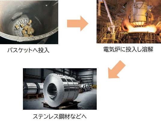 まず、バスケットに対象物を投入します。その後、バスケットから電気炉に投入し溶解し、ステンレス鋼材などに再資源化します。