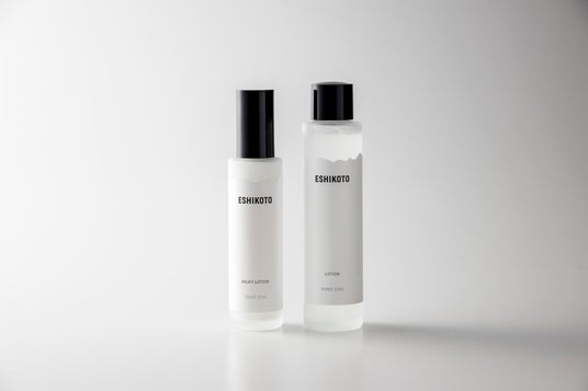 左より「ESHIKOTO-モイスチャーミルク(80ml)」 「ESHIKOTO-ローション (120ml)」