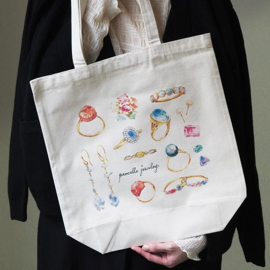 12月25日(水)、おかげさまでPARCELLE JEWELRYは創業11周年を迎えさせていただきます。日頃のご愛顧に感謝を込め、オリジナルのトートバッグを作成いたしました。水彩画風のイラストを厚みのあるキャンバス地にプリント。人気デザインの『ポンポネ』『ミルシェノン』『サンクルール』をイラストに起こし、表面に繊細なタッチで描きました。裏面には、ブラックオパールの遊色効果をイメージした幻想的なデザインを採用しています。本トートバッグは、12月5日(木)より、税込50,000円以上お買い上げのお客様にプレゼントいたします。ただし数量限定のため、なくなり次第終了となります。