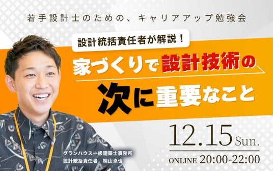 愛知・岐阜・三重を中心に、注文住宅の設計・施工を手がけるグランハウス一級建築士事務所(本社:岐阜県岐阜市、代表取締役:若原涼太)は2024年12月15日(日)にオンラインで「若手設計士のためのキャリアアップ勉強会」を実施します。