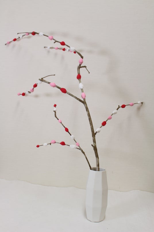 木の枝に、紅白の紙粘土を小さく丸めてつけて作るオリジナルの花餅づくりを体験いただけます。