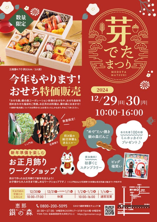 この度、株式会社銀の森コーポレーション(本社:岐阜県恵那市/代表取締役社長:渡邉好作)が運営いたします、食と自然を楽しむ複合施設「恵那 銀の森(以下 銀の森)」内のイベントにて2024年12月29日・30日の2日間、湯気の立ちあがる園内でグルメやお正月準備を楽しむ【芽でたまつり】と称した今年最後のお祭りを開催することとなりましたので、お知らせいたします。