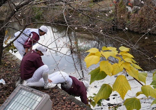 会場となった岐阜市の清水緑地は、JR岐阜駅前で自然に触れることができる市民の憩いの場。普段から地域の人が清掃活動を行うなど、比較的きれいな公園のため、目につきやすい場所にごみは少ないように思われましたが、選手らは次々とごみを見つけ出しました。持ち前のパワーとチームワークで手の届きにくい水際のごみを拾う高校生や、垣根・茂みをくまなく探す大人たち。日中も10℃を下回る寒い日でしたが、会場は選手らの熱気に包まれていました。