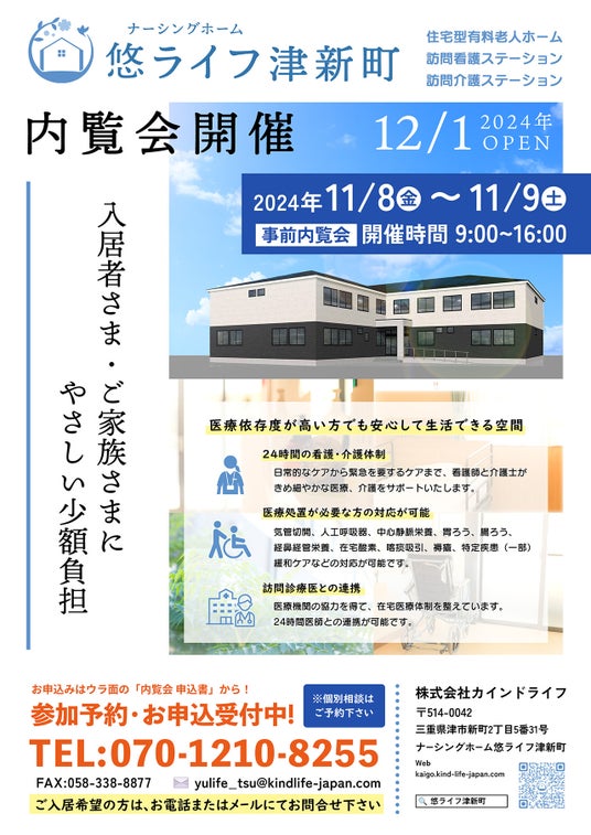 入居者様が安心して暮らせる住環境と24時間体制の医療・介護サポートを提供するカインドライフが、2024年12月1日、三重県津市に「ナーシングホーム悠ライフ津新町」を新たに開設いたします。