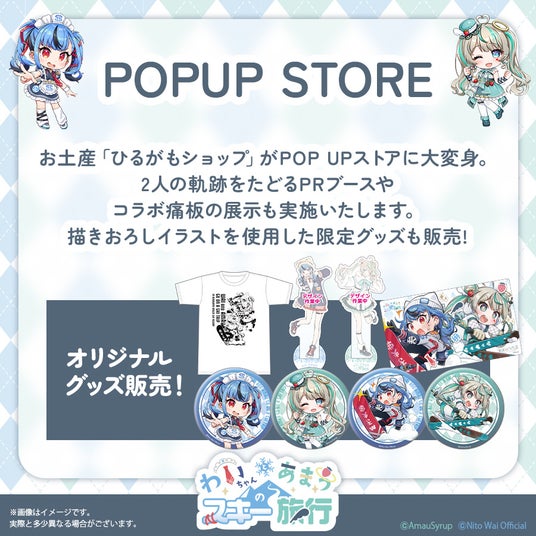お土産「ひるがもショップ」がPOP UPストアに大変身。2人の軌跡をたどるPRブースやコラボ痛板の展示も実施いたします。描きおろしイラストを使用した限定グッズも販売。旅行の定番といえばお菓子のお土産もオリジナルグッズとして販売致します。