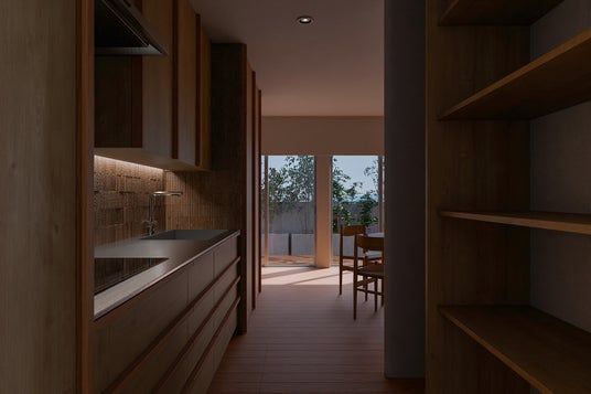床面積23坪の改修。面積の有効活用のためキッチンも通路に取り込んだ設計に。その先に見える植栽も印象的。