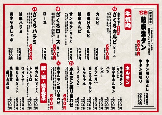 焼肉ホルモンざくろは幅広い年齢層のお客様にお楽しみいただけるように、焼肉定番メニューからサイドメニューまで充実させております。