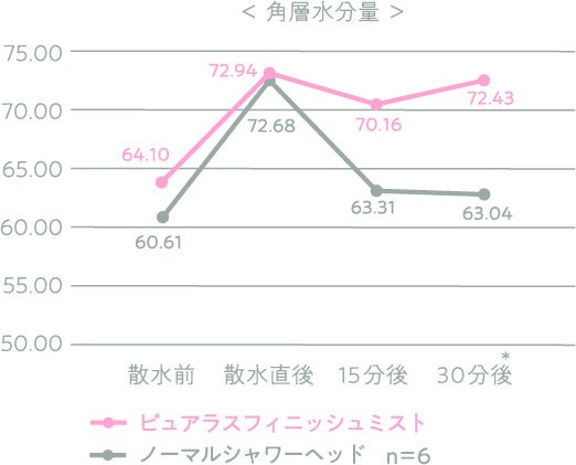 ミストを浴びた後、30分経過をしても肌(頬)の水分量が持続されることが確認されました。