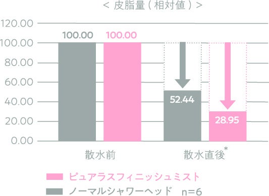 ※5:室温・湿度を一定の環境下にし、水温40℃±1℃にて散水部(額)より同等の距離から10 秒散水。各被験者の散水前(皮脂量)の値を100%とした、散水直