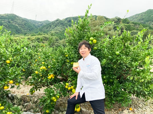 故郷の岐阜県海津市のみかん畑を訪れたグランシェフパティシエ・鈴木滋夫。南濃みかんショコラセレクションは、パッケージも内容も今年バージョンで