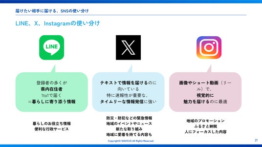 また、中でも自治体様のSNSで活用することが多いLINE・X(旧Twitter)・Instagramについては、ユーザーに伝わりやすい効果的なテキストの書き方やクリエイティブの特徴など、運用ノウハウについても具体的な事例を用いて解説しました。