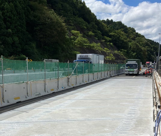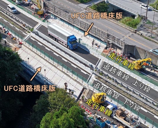 鹿島(社長:天野裕正)は、「UFC※1道路橋床版」を幅員方向分割(2車線道路の場合1車線規制)で施工する「名神高速道路(特定更新等)河内橋他1橋床版取替工事」に導入しました。高速道路本線の床版取替工事において、幅員方向分割でUFC道路橋床版を導入したのは国内で初めてです。車両の通行が可能な幅員方向分割の施工としたことで、工事に伴う交通規制等によるソーシャルロスを低減することができました。