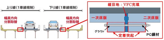 しかし、これまで高速道路本線におけるUFC道路橋床版を導入した床版取替工事は、全断面取替(2車線道路の場合2車線規制)で行ったため、一時的な通行止めが必要でした。高速道路本線での通行止めは、一時的であっても利用者の交通の利便性低下といったソーシャルロスが大きいため、片側車線のみを規制しながら床版を取り替える、幅員方向分割での施工が求められています。