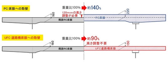 さらに、UFC道路橋床版はPC床版と比べて薄く軽いため、床版取替えに伴う道路面の高さ調整が不要なうえ、鋼桁の補強を最小限に抑えることができます。