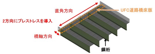UFC道路橋床版は、当社らが開発したUFC「サクセム(R)」で製造したプレキャスト床版に、橋軸方向と直角方向の2方向にPC鋼材を配置し、高いレベルのプレストレスを導入します。これにより、薄肉で軽量ながら高い疲労耐久性を有する道路橋床版を実現しています。