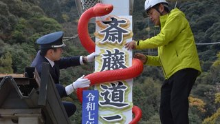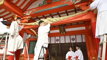 金神社、大しめ縄張り替え迎春準備 岐阜市、金運や商売繁盛に御利益