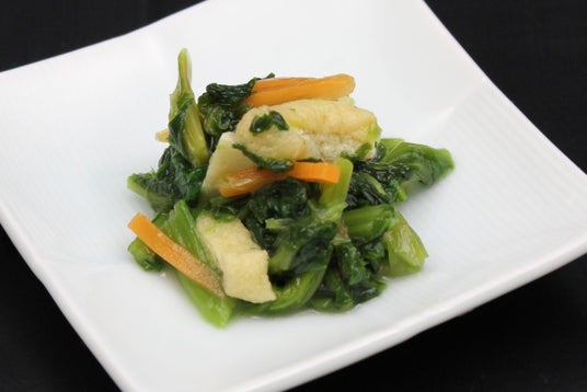 ■からし菜おひたし冬から春にかけて旬を迎えるからし菜は、アブラナとクロガラシの交雑種で、ピリッとした辛さが特徴です。辛子の風味を効かせ、薄めの色の調味料で鮮やかな色に仕上げました。