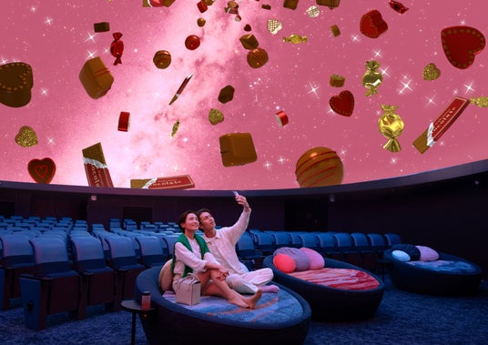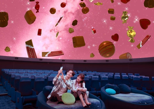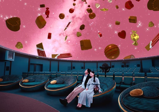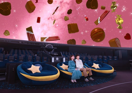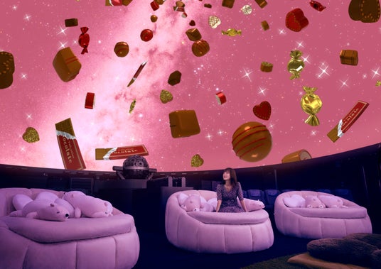 ドーム内に足を踏み入れると、ピンク色の星空にふわふわと浮かぶチョコレートが皆様をお迎えいたします。本編の上映開始までの5~10分間に動画や写真撮影ができる期間限定のイベントで、恋人や大切な人と、ぜひ特別なバレンタインの思い出をお作りください。