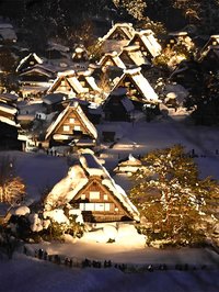 雪化粧の白川郷、光の幻想 積雪163センチ、ライトアップイベント