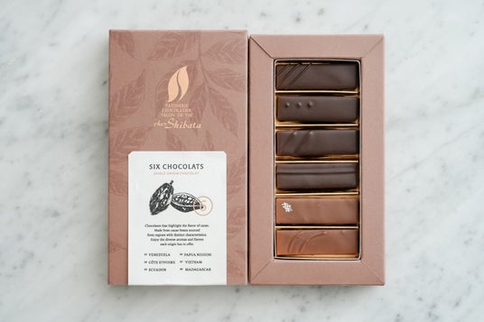 柴田シェフ愛飲のフレーバーティーの茶葉を使った香り高いショコラと、三重県熊野の幻の柑橘「新姫」の果汁にマンゴーを組み合わせたフレッシュな味わいのショコラ。