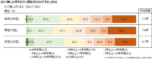 ■“推し”の平均ファン歴は7.11年、女性より男性のほうが長い