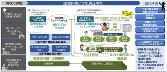 本事業は、最先端の通信技術(ローカル5G)とその配下で稼働するロボット(ドローン)を活用して地域課題の解決を目指す「工業団地共同利用型」実証事業です。