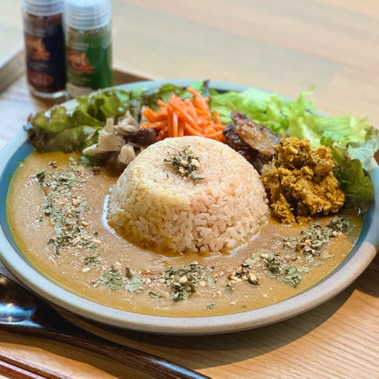 スパイスカレー私たちのスパイスカレーは、医食同源の理念を体現した一品です。野菜だけで満足感を得られるよう、自社の畑や地元の旬の野菜を取り入れ、味噌や塩麹などの発酵調味料を活用し、日本人の口に合うよう工夫しています。アレルギーや健康面でお困りの方、宗教や国籍を問わず、誰もが同じテーブルを囲んで楽しめるメニューです。