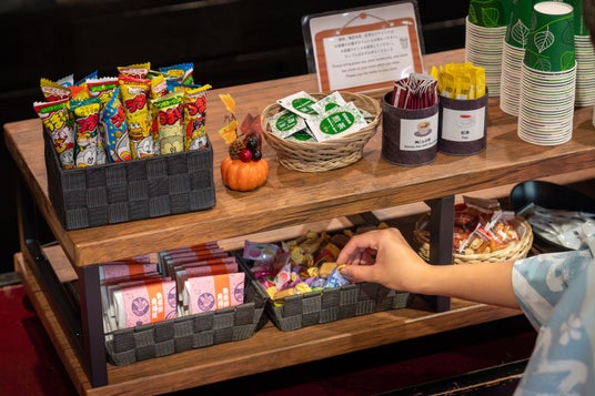 ロビーには駄菓子バーやフリードリンクコーナーを設置し、お子様から大人までお楽しみいただけます。フリードリンクコーナーでは、各種ソフトドリンクやセルフで注ぐビールなどをお楽しみいただけます。お好きな飲み物を片手に、旅の疲れを癒す穏やかな時間をお過ごしください。