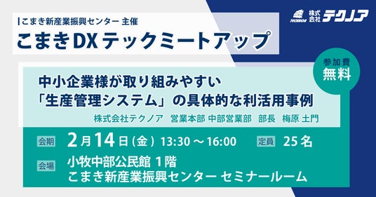 株式会社テクノア(本社:岐阜県岐阜市、代表取締役:山崎 耕治)は、2/14に こまき新産業振興センターで開催されるイベント「こまきDXテックミートアップ」に登壇事業者として参加いたします。