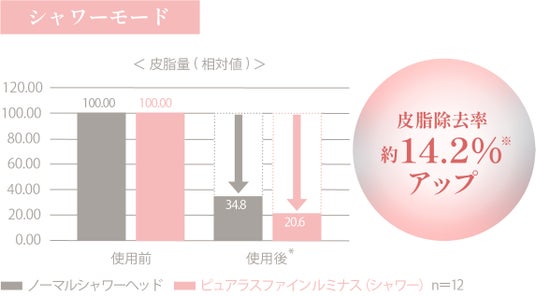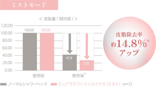<2>皮脂除去率UP/シャワーモード:約14.2%UP(※3) ミストモード:約14.8%UP(※3)