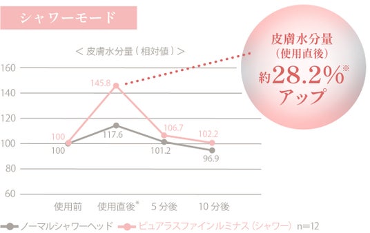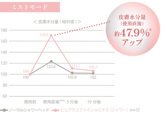 皮膚水分量:シャワーモード 約28.2%UP(※4)/ミストモード 約47.9%UP(※4)※使用直後