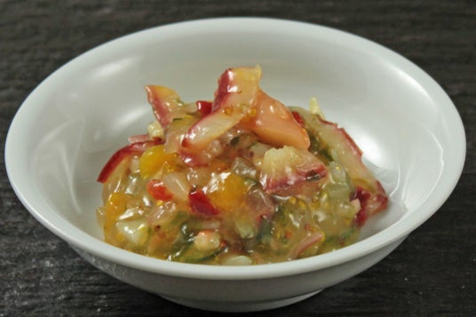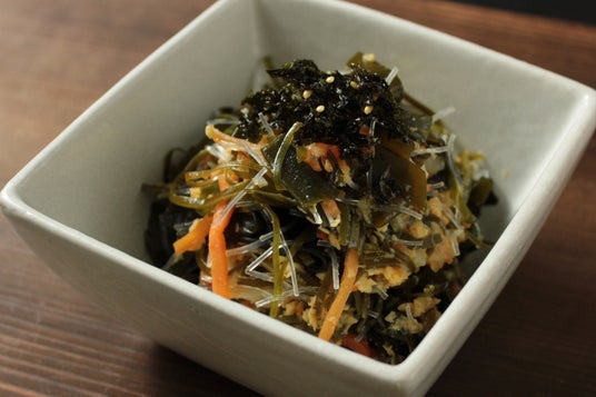 わかめ、ホタテ、たこ、ほやなど7種類の具材をふんだんに使用し、ごま油・にんにく香る韓国風塩だれの絶妙な組み合わせが特徴です。お酒のおつまみやご飯のお供としてもぴったりです。
