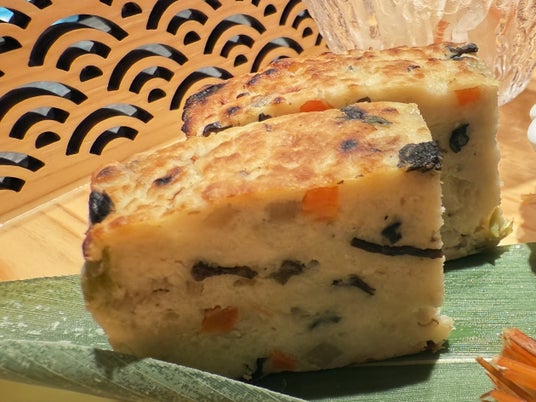 鶏肉を主体に、小松菜、玉葱、人参、ごぼう、きくらげの5種類の具材を練り込んだふくさ焼きです。一般的なふくさ焼きは鶏卵を主成分とすることが多いですが、本商品は鶏肉をベースにすることで、より食べ応えのある仕上がりとなっております。断面の彩りも美しく、前菜や八寸、お弁当の一品として最適です。解凍後にお好みのサイズにカットするだけで提供できるため、調理の手間を省くことができます。