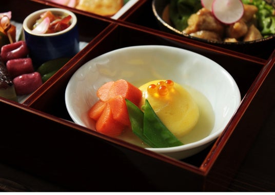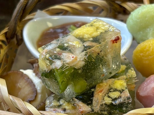 春を感じさせる一品です。桜海老と菜の花を寄せ固め、白だしベースの優しい味わいに仕上げました。底には菜の花、天面には玉子そぼろを散らし、菜の花畑をイメージした彩り豊かな見た目も特徴です。解凍後そのまま提供できるため、先付けや前菜として手軽にご活用いただけます。