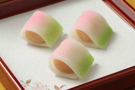 伝統的な上生菓子「落とし文」を春の三色でアレンジしました。自家製のしっとりとした白餡を使用し、透明感のある上品な仕上がりです。
