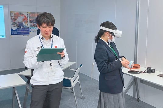 建設工事の時間では、3DCADを使った実際の図面など、最新技術を含んだ仕事内容を紹介したほか、運転・維持管理の時間では、VRを使って実際の下水処理場を施設見学し、綺麗になった水が川に放流されるまでの過程を施設内から放流口まで見学することができました。