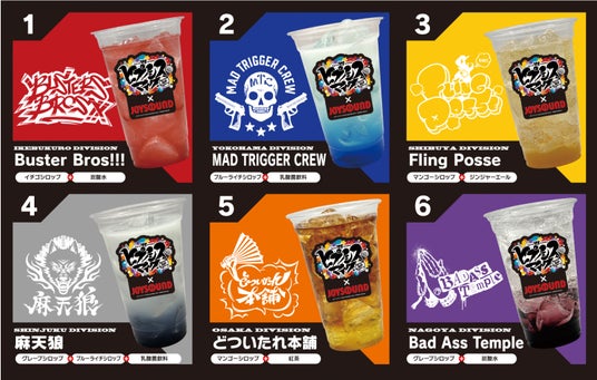 コラボドリンクは、映画『ヒプノシスマイク-Division Rap Battle-』の各ディビジョンをイメージした「Buster Bros!!!」「MAD TRIGGER CREW」「Fling Posse」「麻天狼」「どついたれ本舗」「Bad Ass Temple」の全6種[各700円(税込)ノンアルコール]をご用意します。