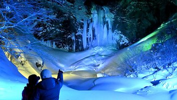 凍る巨大な滝、厳冬の芸術…そして観賞後は温泉へ 平湯大滝ライトアップ、岐阜・高山市