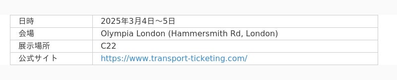 Transport Ticketing Globalに出展します 2025年2月20日 14:00 レシップ レシップグループは、イギリス・ロンドンで開催される世界最大級の公共交通チケッティング・モビリティイベントTransport Ticketing Globalに出展します。 今回の出展では連結子会社LECIP ARCONTIA AB(本社:スウェーデン)が開発した新型バリデータ LV-800や、キャッシュレス端末の出展を予定しています。 皆様のご来場を心よりお待ちしております。 Transport Ticketing Global 企業プレスリリース詳細へPR TIMESトップへ トップ PR TIMES Transport Ticketing Globalに出展します 関連記事 店頭で 「焼きたての〈ゆかり〉」を、もっと楽しむ!「BANKAKU FACTORY SHOP」に期間限定チーズトッピングが登場! アミューズメントフィットネスクラブ フィットイージー「いびがわマラソン2025」にブース出展 「地域で最も愛される企業」へ ―― 株式会社ファミリー、創業46年目の大転換感謝祭を初の一般開放、新ブランド体験と1万人規模の地域交流イベントで地域に恩返しを一般公開〈入場無料〉 【和泉市初出店!】オーダースーツ専門店グローバルスタイルが『GINZAグローバルスタイル・コンフォート ららぽーと和泉店』を2025年11月13日(木)にGRAND OPEN!事前のご来店予約も受付中 災害時の迅速な物資支援を実現するため、愛知県名古屋市と連携協定を締結 【名古屋市】アライブ冬休みイベント「英語のウィンタースクール2025 ~SOUND SAFARI~」を開催 !心を通わせるワクワクの冒険にでかけよう おすすめ記事 「各務原キムチの素」開発目指しクラファン募る 家庭で手軽に&減塩で健康志向 【速報】全国高校サッカー岐阜県大会 帝京大可児7連覇 餅高騰、もち米生産者の主食米移行で品薄に 岐阜県内の専門店も悲鳴 岐阜県民「生活苦しい」61・9%、リーマン超え過去最悪 県政世論調査