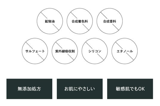 共通無添加項目:パラベン、合成着色料、合成香料、エタノール、サルフェート、石油系界面活性剤、紫外線吸収剤