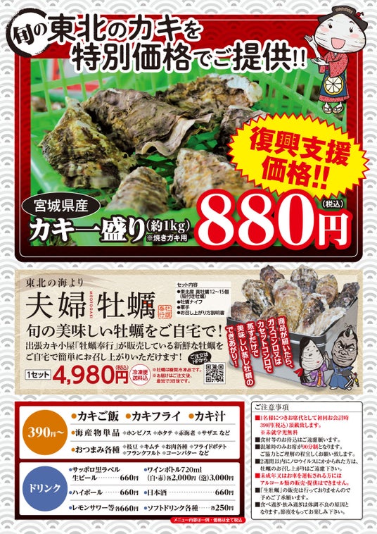 牡蠣は「石巻産殻付き真牡蠣」(約1キロ=殻付き4~6個)通常1,320円を東北復興支援価格として1盛り880円で提供するほか、「石川県能登産牡蠣」(約4個)「岩手県山田町産牡蠣」(約4個)「瀬戸内産牡蠣」(約8~15個)(以上1,200円)を用意。