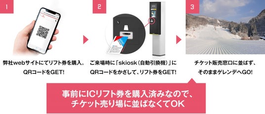 「skiosk(R)」の利用方法は、当社専用EC サイトにて予め希望リフトチケットをオンライン購入し、発行された QR コードを 現地の自動発券機「skiosk(R)」にかざすことでリフト券をスムーズにお受け取りいただけます。