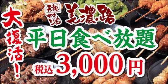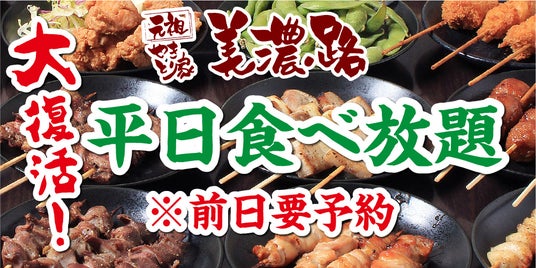 株式会社あみやき亭(代表取締役社長:宮崎卓也)が運営する【美濃路】【みの路】でかつて大人気だった平日食べ放題が復活します!
